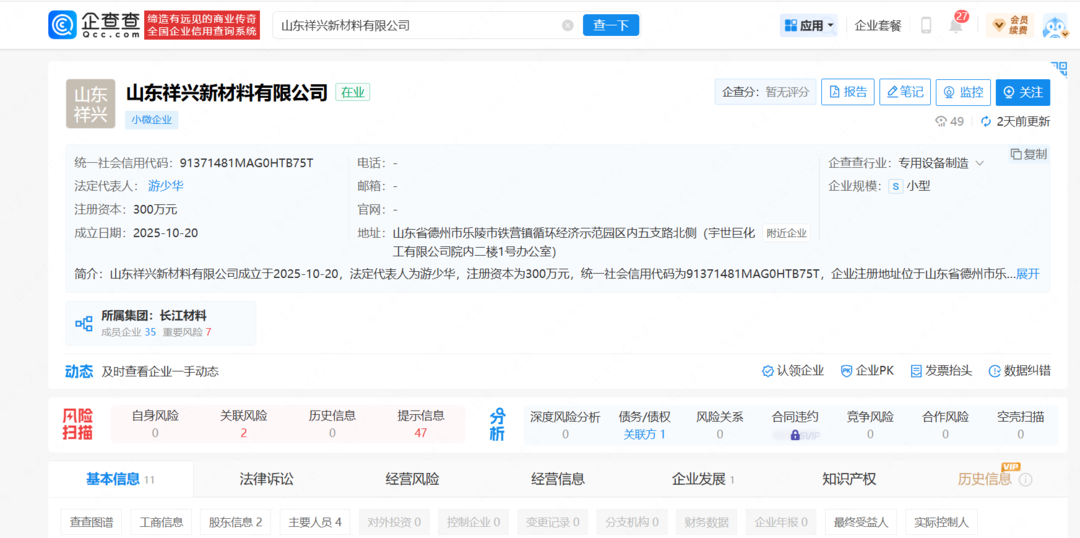 企查查信息显示,近日,山东祥兴新材料有限公司(下称“山东祥兴”)成立,注册地山东省德州乐陵市,注册资本300万元,法定代表人为游少华。经营范围包含:新材料技术推广服务;铸造用造型材料销售;热力生产和供应等。